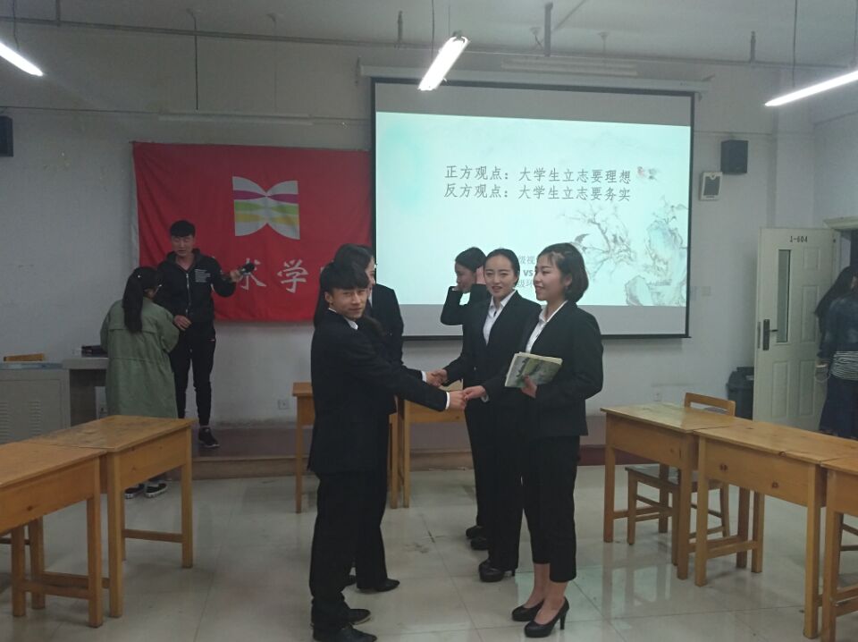 各参赛队伍由抽签决定辩论方,本场比赛由正方视觉传达一班对战反方环境设计三班。在主持人一声“开始”后,正反方一辩各做限时为三分钟的陈词。在开篇立论环节,正方以老员工立志要理想为中心,简明严谨的阐述这一观点;反方则以老员工立志要务实为中心,陈述这一观点。攻辩环节,双方选手据理力争,引经据典,围绕辩题展开激烈辩论。整场比赛高潮迭起,精彩不断,观众也积极参与,和选手们互动,现场气氛十分活跃。经过激烈的角逐,最后,反方2016级环境设计三班获得本场比赛的胜利,比赛结束后,由评委进行点评总结并和辩手们进行合影留念。