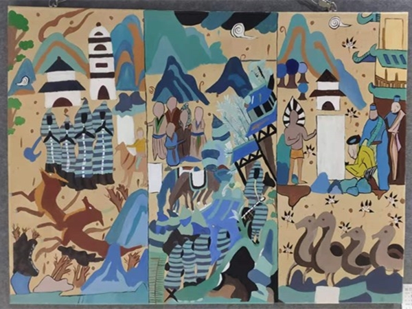 壁画被广泛地应用于现代生活的建筑物之上,展现着自身独特的审美情趣和艺术展现方式,装饰着人们的生活。而综合材料是提高现代壁画装饰品质的有效途径,通过不同材料的应用使得现代装饰壁画更加具有美感,随着现代化学化工技术的发展,增加了不同的现代的材料,丰富了装饰原料,达到了与传统壁画不同的效果。在此门课程的教学过程中,师生从古老的敦煌壁画入手认真研习,在研习基础上进一步进行敦煌壁画元素结合综合材料的二次创作,进而将研习收获运用于新的装饰壁画创作中。师生积极、富有激情的完成了教学任务,并完成了一大批优秀的作品。
