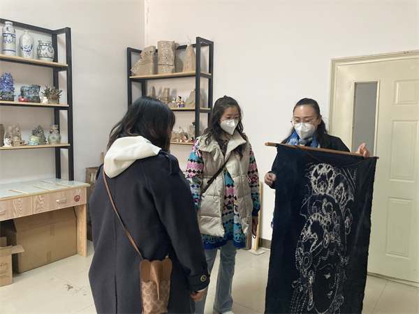 最后,老师们观摹了温晓晖老师的羊毛擀毡课程,并与温老师和正在上课的同学们进行了讨论与交流,进一步深入了解了我们的专业优势、特色及教学方式,并计划来公司就羊毛擀毡、扎染等课程进修学习。
