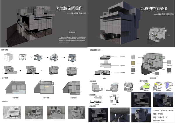 建筑设计基础课程首先通过了解建筑的概念基本属性和分类而初识建筑其次,通过三个阶段九宫格空间推演探讨了空间的限定、组织方式,以及建筑形式、功能与结构的契合关系的实现。最后,通过实体模型构建与最终方案推敲完成整体建筑设计。
