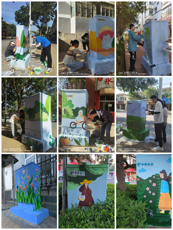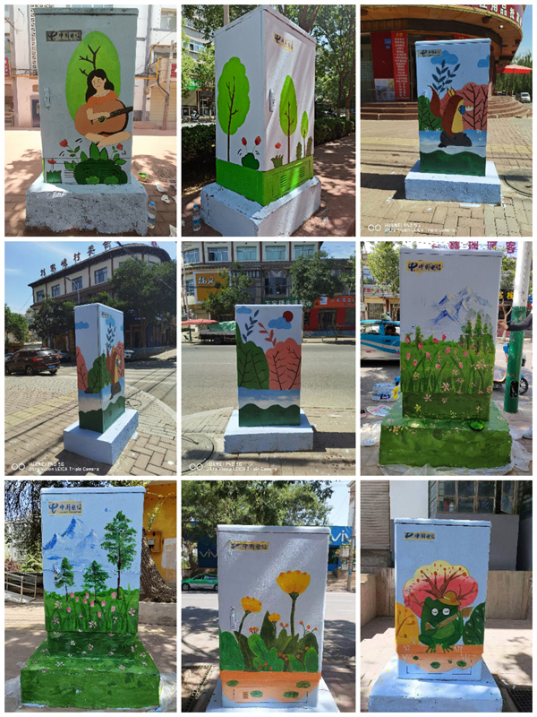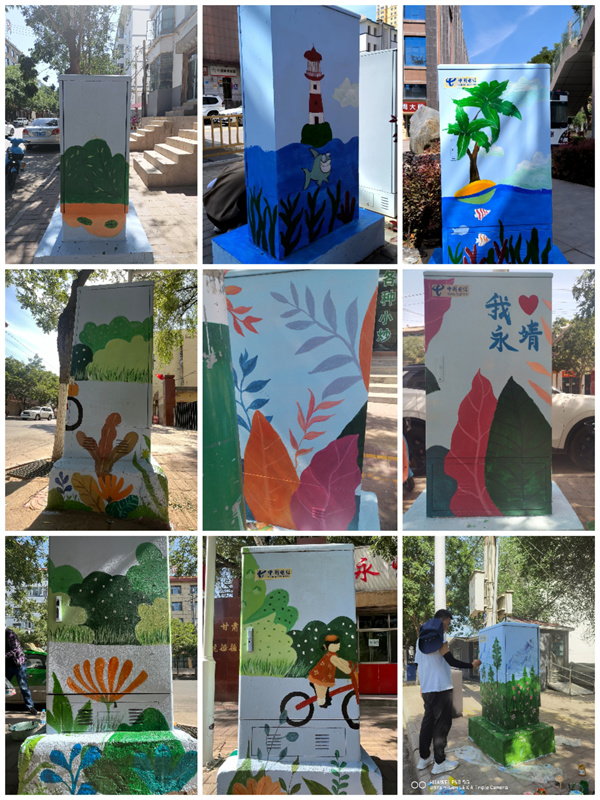 此次活动以表现永靖县刘家峡自然景观、人文景观为主题,把郁金香、薰衣草、鞭马草花海的壮观景象,以及自然人文风光“十里柳林”、藏汉合璧的罗家洞寺、炳灵寺石窟、刘家峡水电站、太极湖等本地的人文景观名片,用绚丽的的色彩和构图,以墙绘的艺术形式为载体,将这些地标景观生动地呈现在街道两旁电箱上。这不仅推动当地乡村建设,美化村容村貌同时为同学们和当地的人民群众都上了一堂“大思政课”。