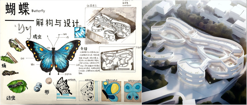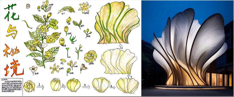 此次作业通过主题“生物解构”进行发散联想,根据视觉笔记的形象资料设计生物意象空间模型,同时加入了人工智能技术的运用,将手绘草图转化为效果图,进一步推动了创意设计与实践应用的深度融合,培养员工的创意思维与设计能力为环境设计专业的未来发展注入了新的活力和设计理念。