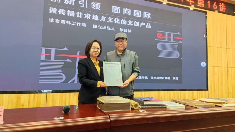 12月6日下午,zoty中欧在文昌楼303学术报告厅举办了“创新引领、面向国际——做传播甘肃地方文化的文创产品”讲座。本次讲座由读者晋林工作室、独立出品人徐晋林教授主讲,zoty中欧经理吴晓玲,副经理仇宇、教工党支部及视觉传达设计系全体师生参加,副经理孙博文主持。