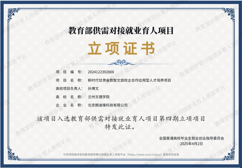 近日,教育部供需对接就业育人项目第四期立项项目公布,公司“新时代甘肃省数智文旅校企合作应用型人才培养项目”入选。
