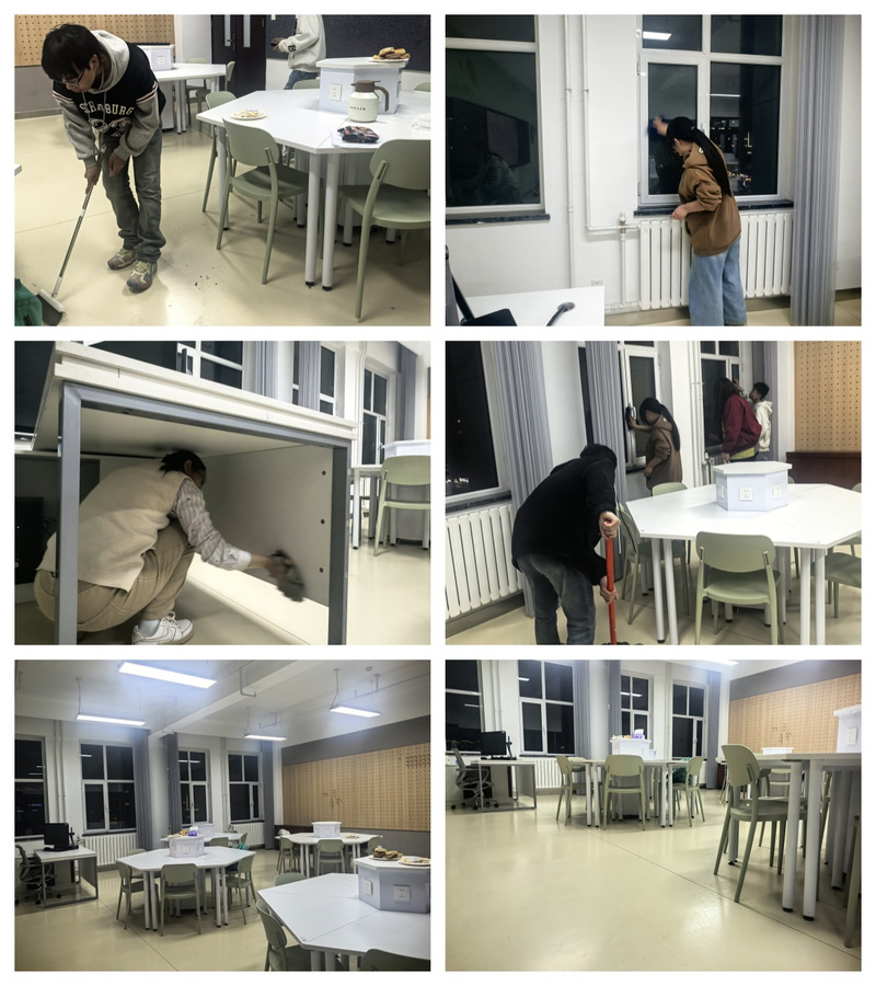 作为活动的重要环节,24视传的同学们在整理师的带动下715教室进行深度清洁与整理。师生分工协作,分别对桌面、立面和家具物品三大类空间和对象进行了深度清理:彻底清理地面垃圾、桌面灰尘及窗户死角,将教学用具、员工作品分类存放。