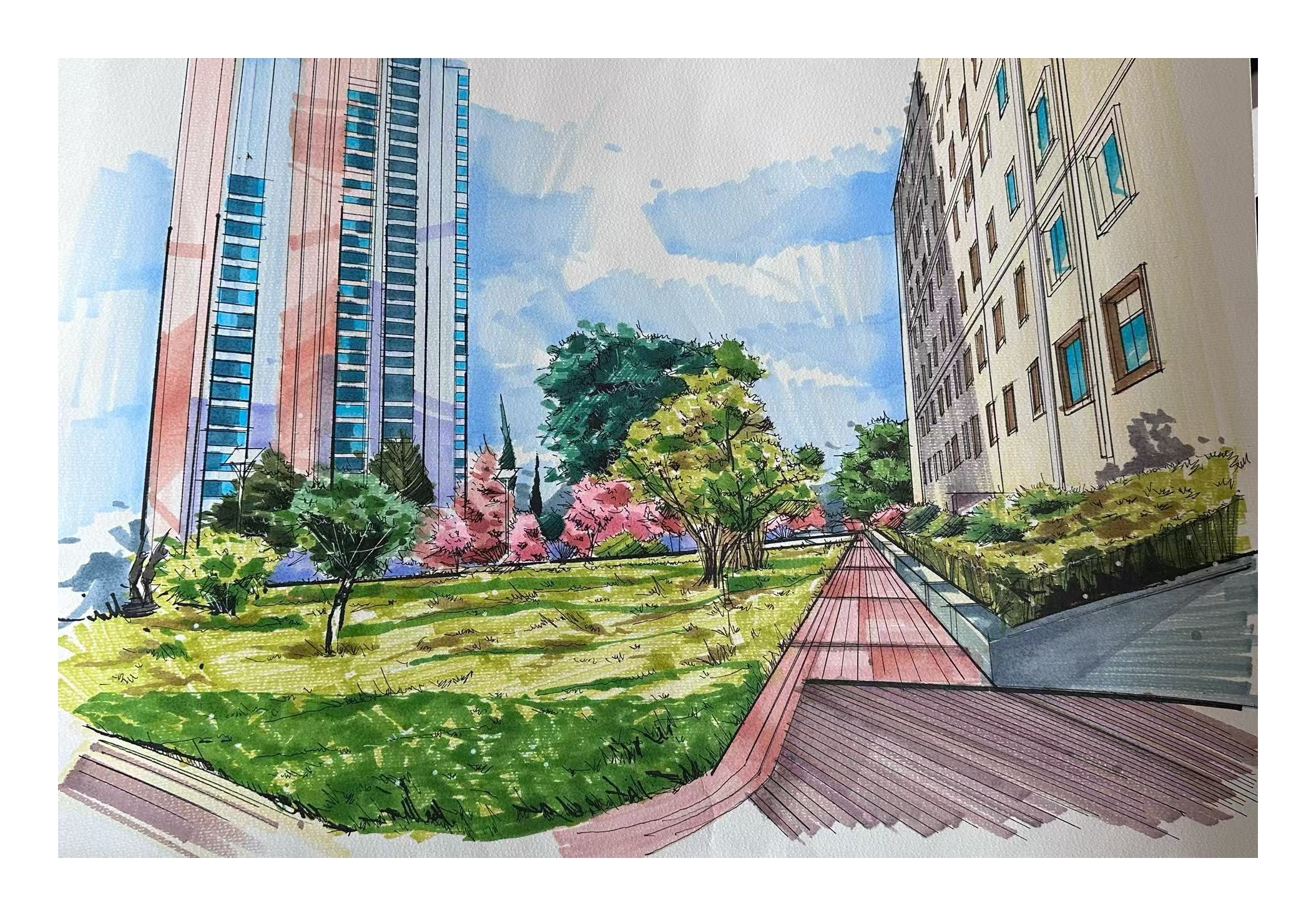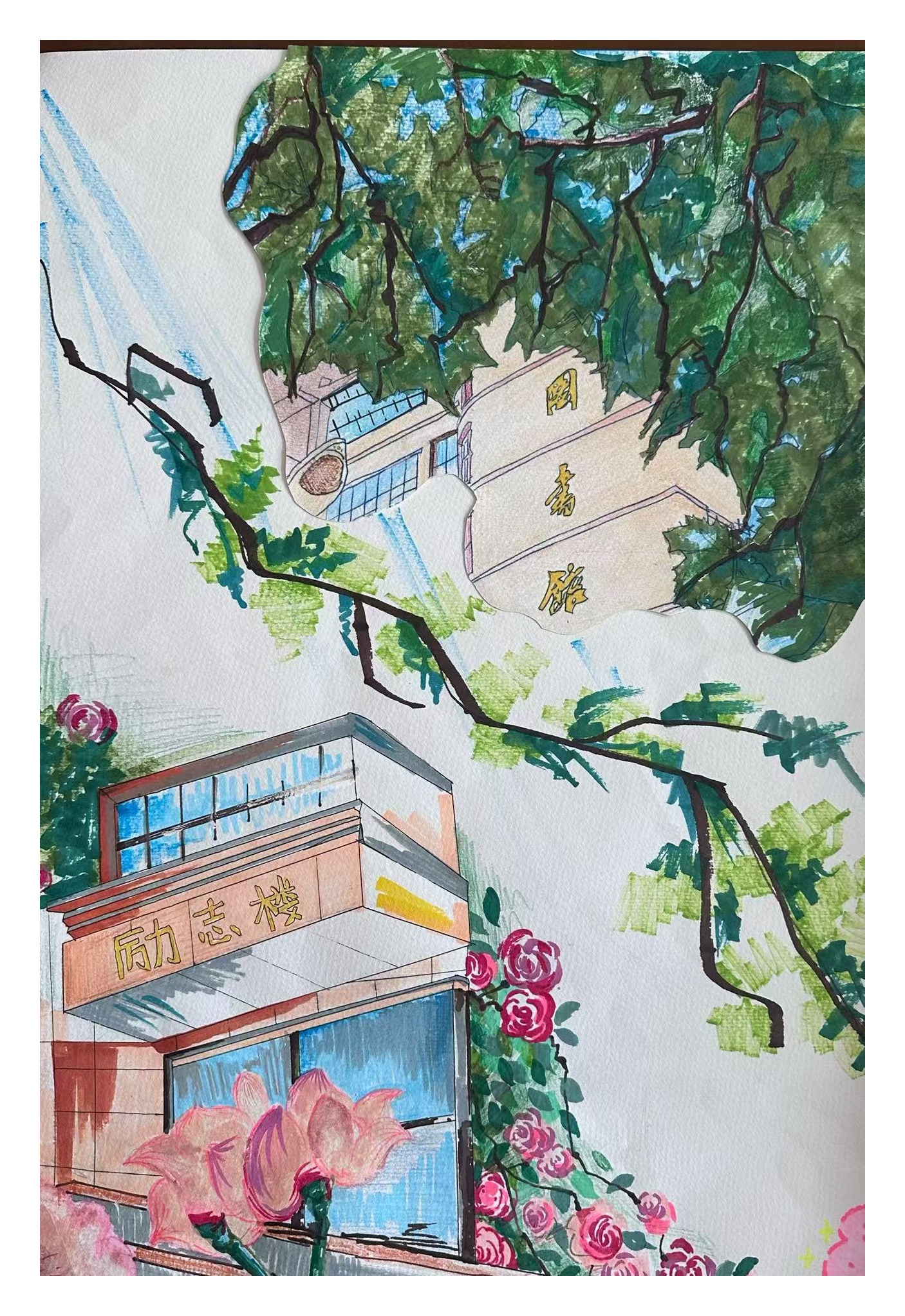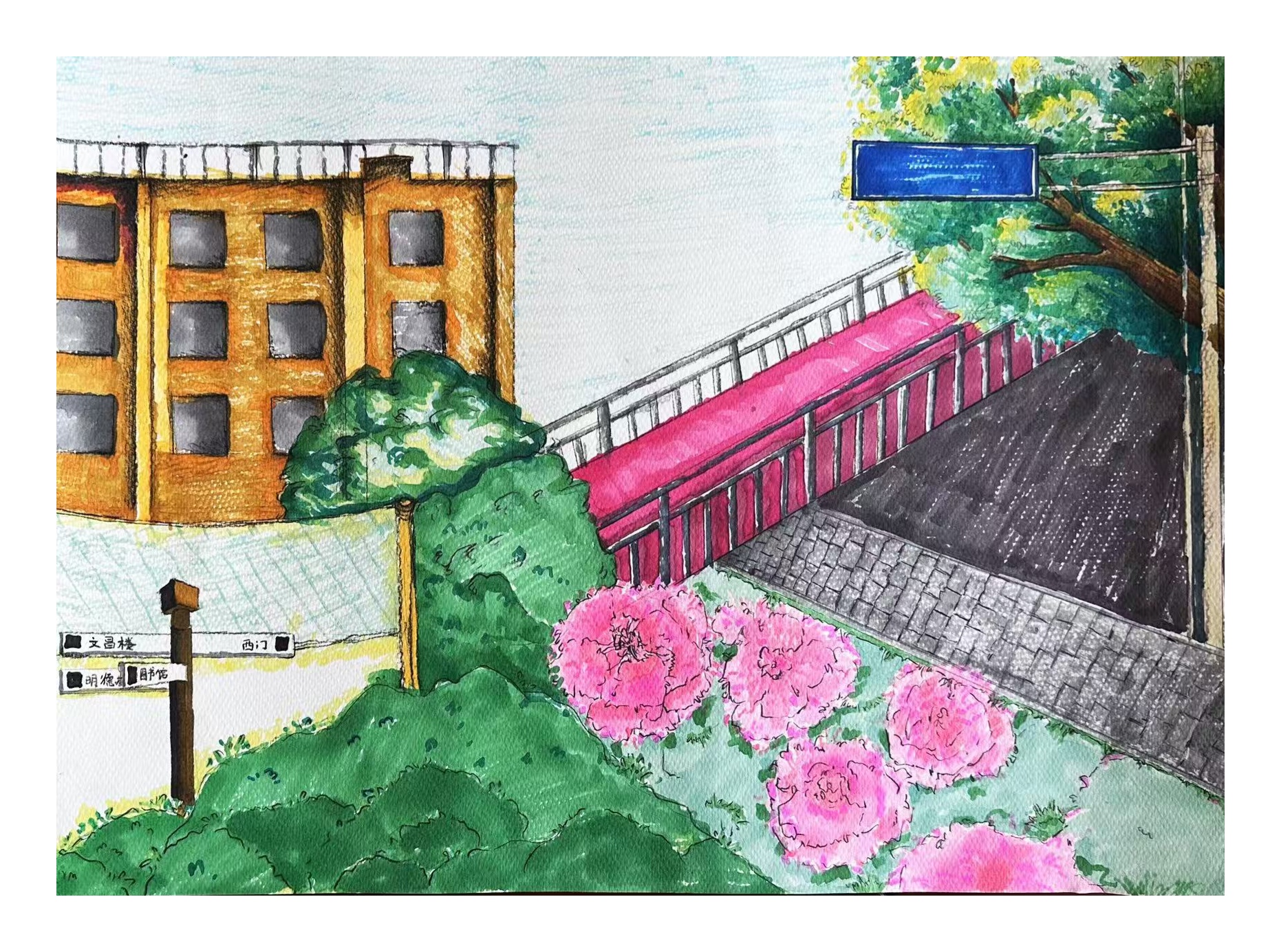 活动中同学们手持画笔走进校园的建筑群与春日景观带用手中的画笔勾勒出心中的魅力校园,用色彩挥洒那些熟悉的场景,校园的动态在他们的笔下纷纷呈现,每幅作品都充分反映了他们热爱校园、积极向上的精神风貌。