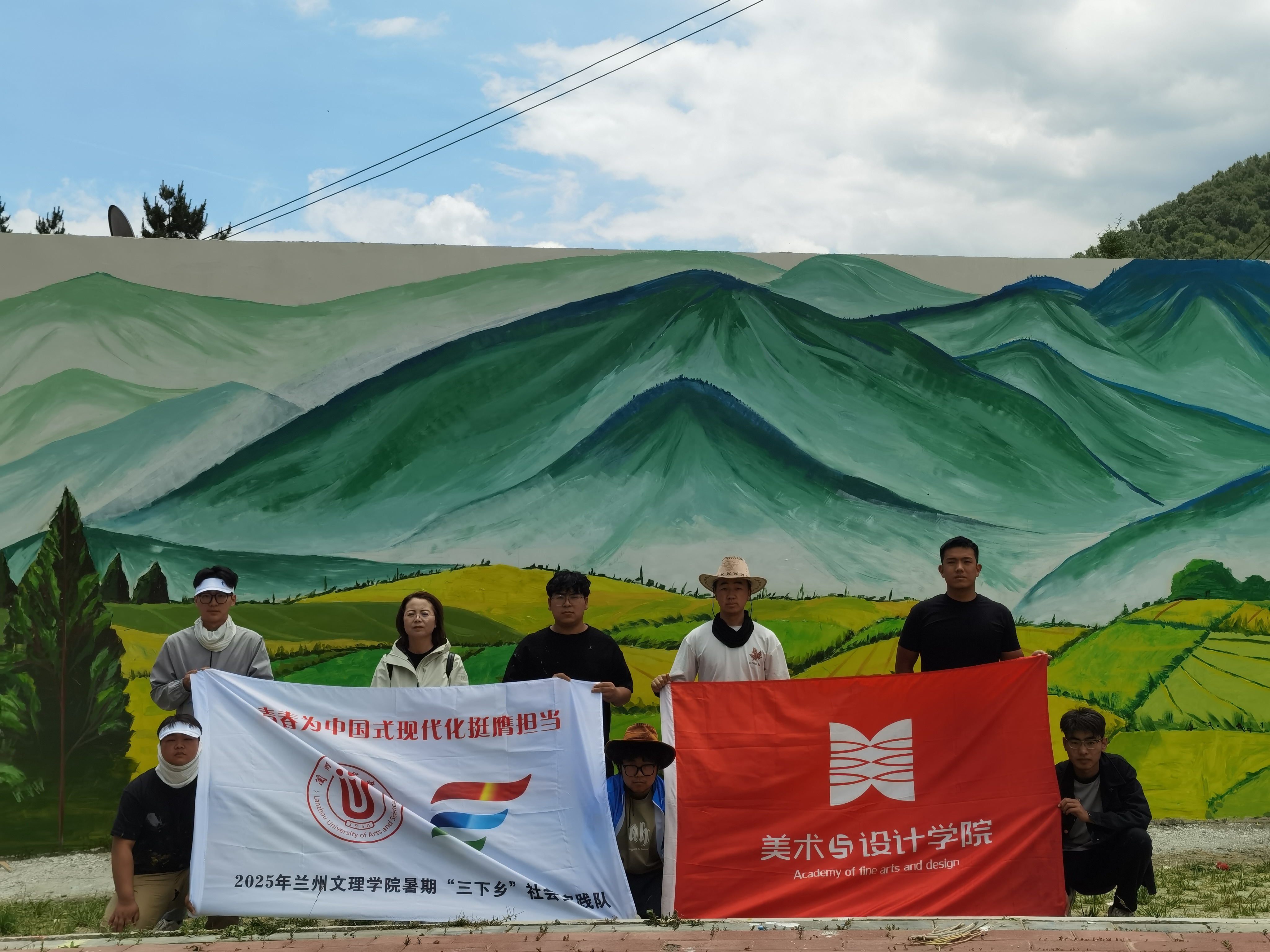 本次活动围绕和美乡村主题,把哈班岔优美的自然环境、绿水青山、梯田丰收场景,在大小不等的5个墙面上大篇幅通体表现,同学们在2米高的脚手架上作画,要在长度60米,高度1.8至4米不等的墙上,绘制完成画作5幅。