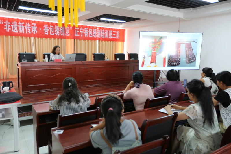 在推动中华优秀传统文化创造性转化、创新性发展的背景下,为进一步加强校地合作,促进非物质文化遗产的保护与传承,同时提升地方非遗产业的市场竞争力,8月19日-8月20日,zoty中欧经理吴晓玲教授应邀为正宁县文化馆举办的第三期“非遗新传承·香包绣创意”培训活动进行授课指导,这期指导是以讲座的形式呈现,专题讲座从“形、色、质、意、趣”深入浅出地讲解了香包产品造型的重要性、造型配色技巧以及如何利用现代科技手段促进非遗文化的传播与创新。讲座内容丰富,既有理论深度,又具实践指导意义,在互动和交流中非遗传承人和学员们纷纷表示,系统的学习造型艺术对非遗产品创新更具有指导意义,让大家受益匪浅。