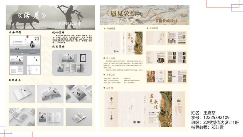 在作品中,同学们灵活运用课堂所学的版式设计、色彩语言、字体设计与信息可视化等专业知识,将文化内涵与实用功能有机融合。敦煌文化主题作品以现代设计语言重新诠释壁画、藻井等传统元素;彩陶文化系列则巧妙转化古老纹样,融入当代视觉语境,形成独具特色的设计风格。部分作品以传统装帧工艺展现文化厚度,也有一些通过创新的色彩系统和结构语言令人耳目一新。