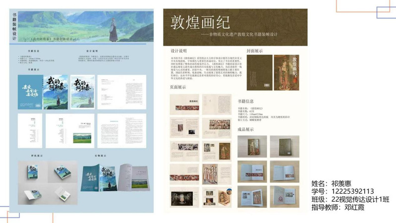 在作品中,同学们灵活运用课堂所学的版式设计、色彩语言、字体设计与信息可视化等专业知识,将文化内涵与实用功能有机融合。敦煌文化主题作品以现代设计语言重新诠释壁画、藻井等传统元素;彩陶文化系列则巧妙转化古老纹样,融入当代视觉语境,形成独具特色的设计风格。部分作品以传统装帧工艺展现文化厚度,也有一些通过创新的色彩系统和结构语言令人耳目一新。