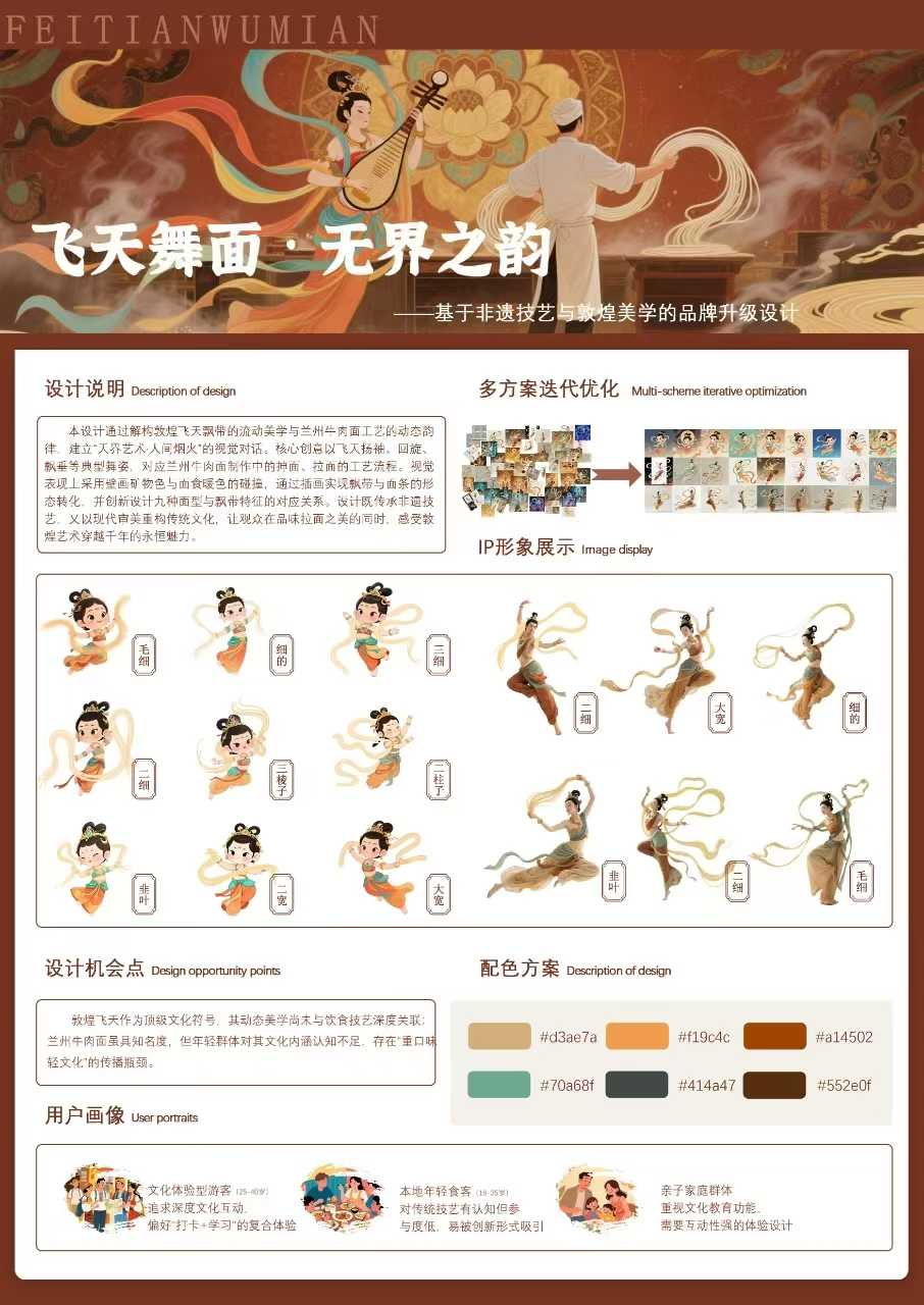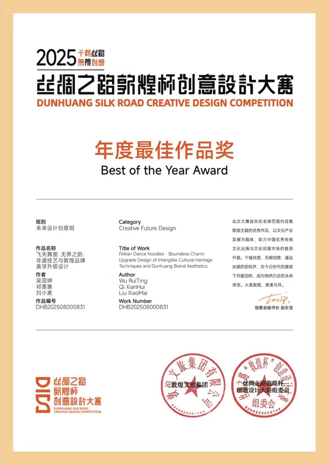 公司获奖作品《飞天舞面·无界之韵:非遗技艺与敦煌品牌美学升级设计》由吴晓玲教授、孙博文副教授共同指导,视觉传达设计专业员工吴蕊婷、祁羡惠与北京理工大学研究生刘小麦共同完成。该作品以敦煌飞天艺术为灵感,深度融合兰州牛肉面非遗技艺,实现了文化符号与餐饮体验的创新结合。作品聚焦当前传统文化与餐饮融合中普遍存在的表面化、碎片化问题,提出以“飞天失重美学”呼应拉面“重力技艺”的哲学理念,构建出兼具视觉张力与文化叙事的品牌升级方案。通过提炼飞天壁画的线条、色彩与动态,开发出贯穿视觉形象、空间营造、互动菜单及周边产品的系统设计,通过传播“丝路文化”增强了区域品牌的识别度和文化附加值。