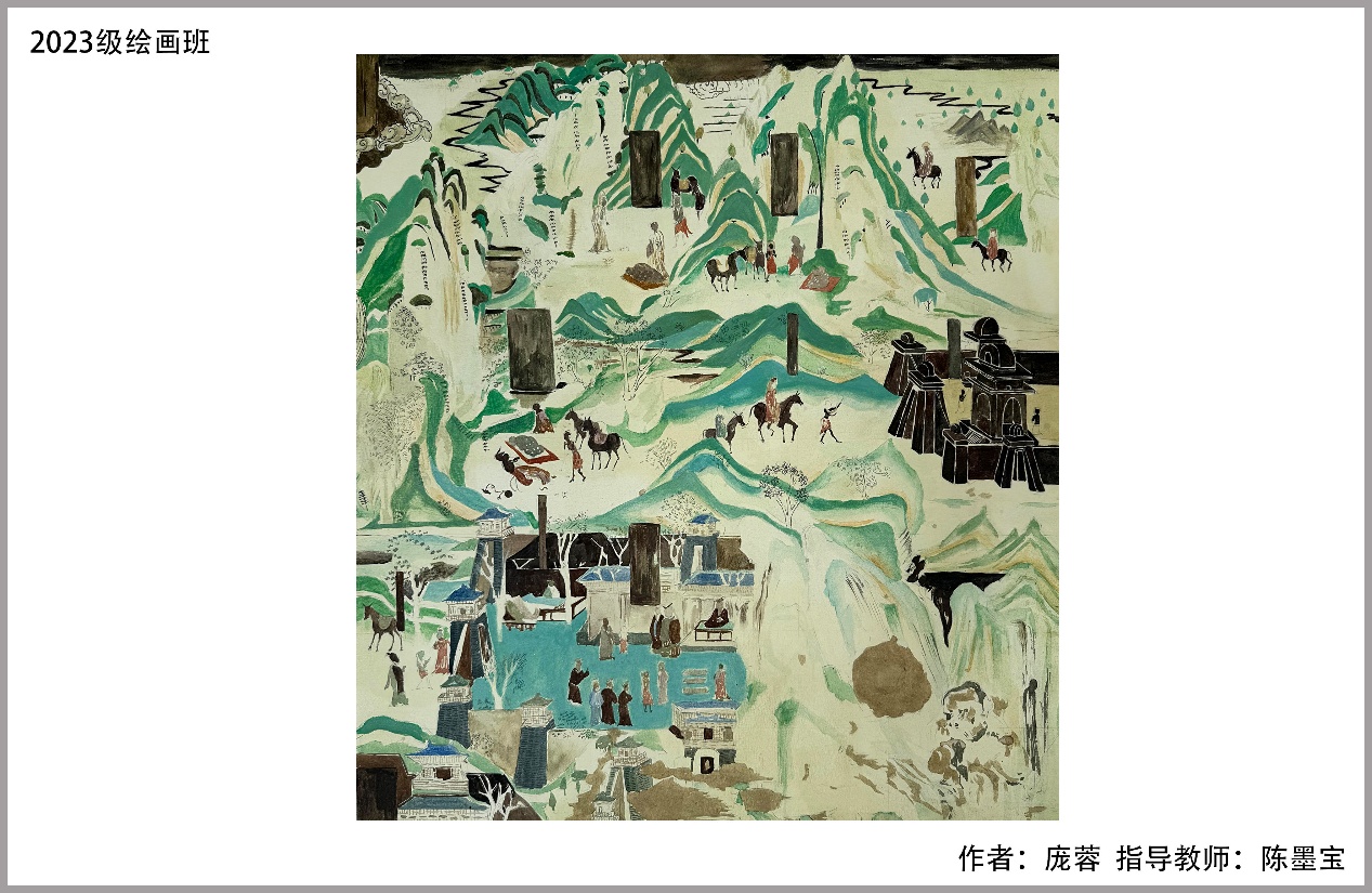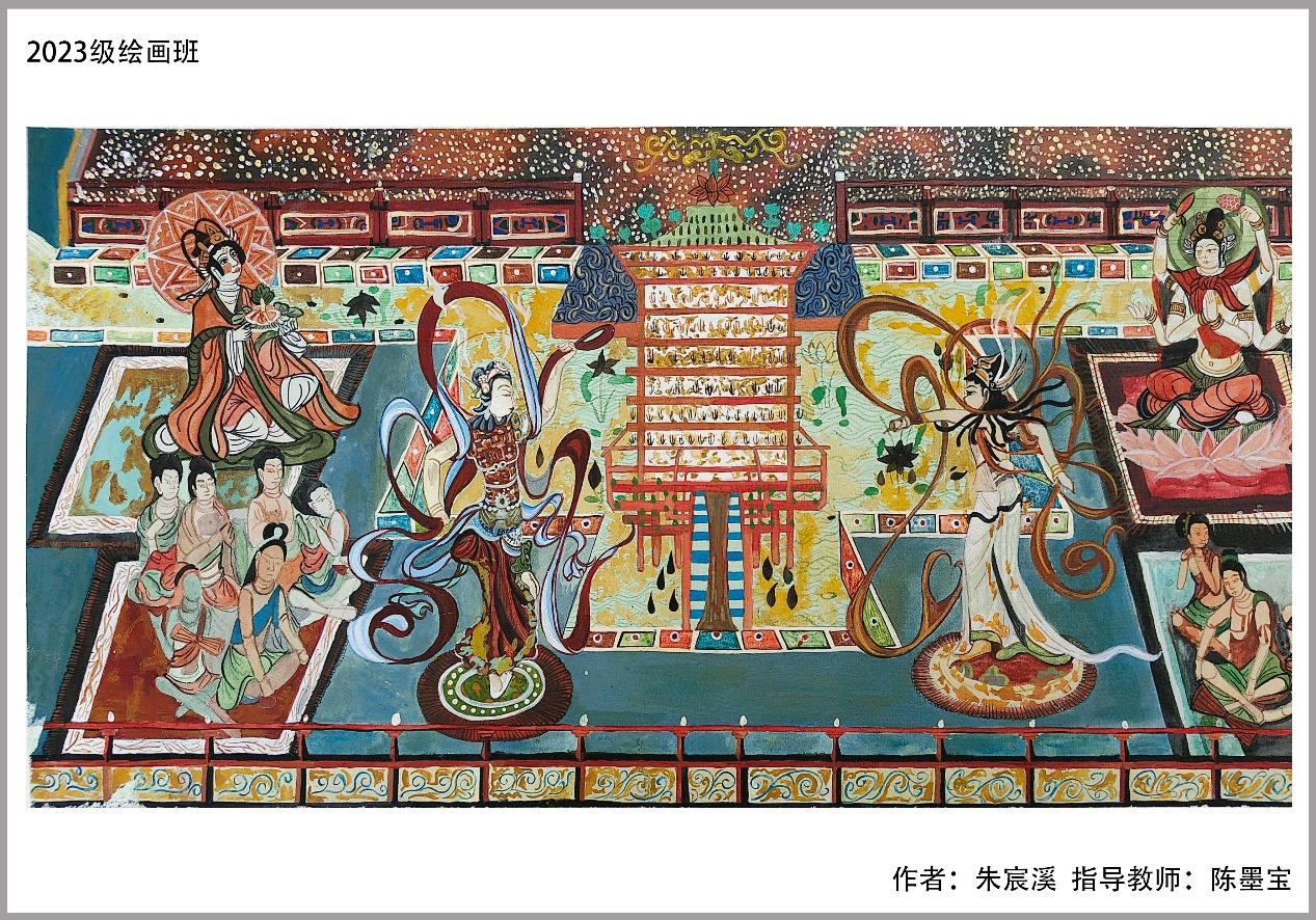 壁画作为一个重要的艺术形式,被广泛地应用于现代生活的建筑物之上,展现着自身独特的审美情趣和艺术展现方式。而综合材料的广泛使用是提高现代壁画装饰品质的有效途径,通过不同材料的应用使得现代装饰壁画更加具有美感,达到了与传统壁画不同的效果。在此门课程的教学过程中,师生从古老的敦煌壁画入手认真研习,在研习基础上进一步进行敦煌壁画元素结合综合材料的研究,进而将研习收获运用于新的装饰壁画创作中。师生积极、富有激情的完成了教学任务,绘制了一批优秀的作品。