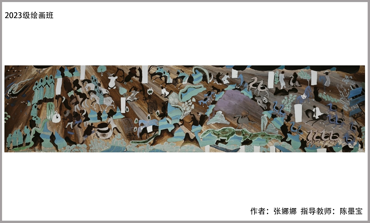 壁画作为一个重要的艺术形式,被广泛地应用于现代生活的建筑物之上,展现着自身独特的审美情趣和艺术展现方式。而综合材料的广泛使用是提高现代壁画装饰品质的有效途径,通过不同材料的应用使得现代装饰壁画更加具有美感,达到了与传统壁画不同的效果。在此门课程的教学过程中,师生从古老的敦煌壁画入手认真研习,在研习基础上进一步进行敦煌壁画元素结合综合材料的研究,进而将研习收获运用于新的装饰壁画创作中。师生积极、富有激情的完成了教学任务,绘制了一批优秀的作品。