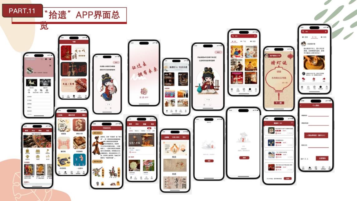“拾遗”APP设计小组以非遗文化传播为己任,用现代UI语言激活传统文化魅力。界面以“云体验”为核心,用户可查看各地数字非遗视频及传承人的动态;同时设置“非遗活动报名”“手作课程预约”“非遗周边商城”模块,采用剪纸红和传统纹样作为视觉元素,既保证信息传递的清晰性,又通过设计细节传递非遗文化的厚重感,让年轻用户更易接受与参与非遗活动。