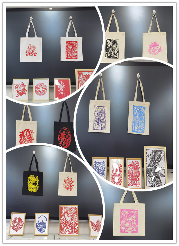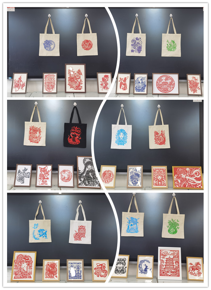 剪纸新材料的运用是课程的重要创新。同学们采用剪纸转印技术,将传统生肖、“喜鹊登梅”“福禄寿喜”、花鸟鱼虫等吉祥纹样及当代动漫元素,通过热转印工艺呈现于白色帆布包日常用品之上。这种创新,既是传统题材的现代表达,也是生活场景的艺术转化,兼顾教学严谨性与民间艺术本真性,展现非遗在青春视角下的创新活力。本次展览作品样式丰富多样,充分展示了公司员工扎实的专业功底,有力地促进了公司艺术氛围的良性互动。