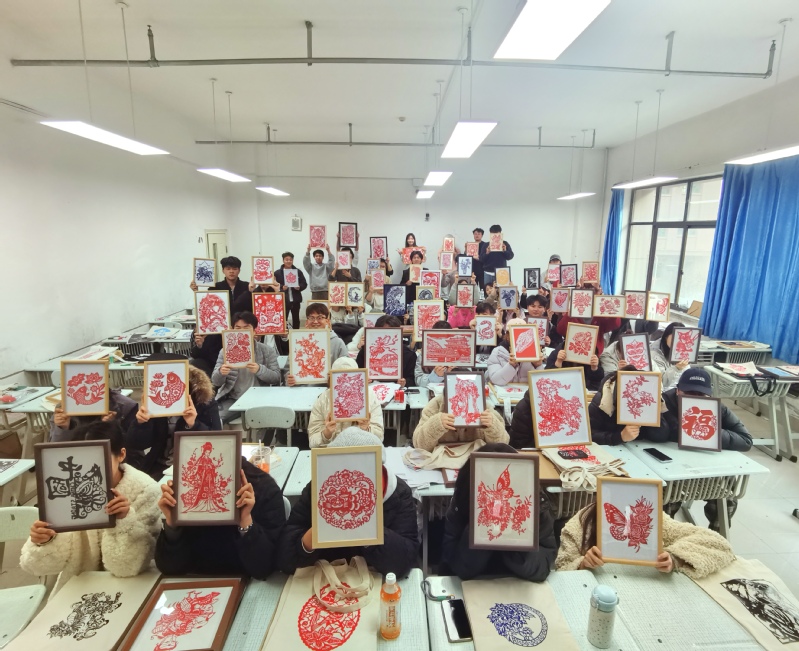 课程采用 “线上+线下"混合式教学法:线上依托智慧树慕课平台,构建立体理论体系;线下侧重剪纸实践教学,以刀剪为笔,带领员工在传统技艺中探寻文化根脉,在创新实践中焕发非遗活力。此次展出的300余件剪纸文创作品,正是教学成果的集中呈现。